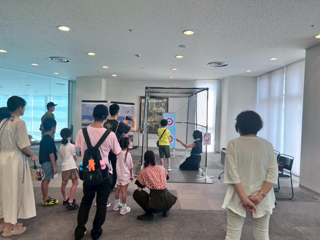 ロビーに設けた手裏剣体験コーナーでは、正荘殿と凪が来場者を迎えました。子どもたちが投げるたびに歓声が上がり、保護者の方々も一緒になって挑戦するなど、終始和やかな雰囲気でした。